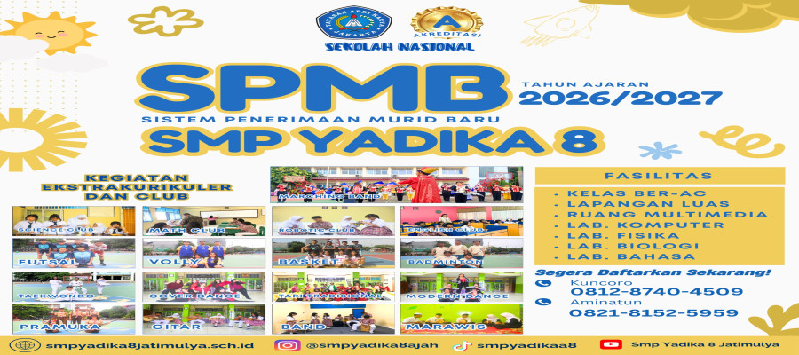 • SMP Yadika 8 hadir sebagai tempat bertumbuhnya generasi yang cerdas, berkarakter, dan siap melangkah lebih jauh.. SMP Yadika 8